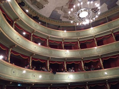 Entro no Teatro Sociale Giorgio Busca a poucos minutos da hora marcada. Sala bonita, parecida com o Teatro Nacional S. João. A plateia está cheia e como só restam lugares longe do palco opto por um dos camarotes. Muitos intelectuais, muitos jovens, muitos adolescentes. A mulher está sentada na segunda fila.